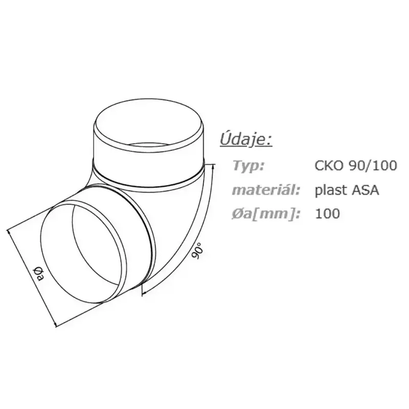 Parametre produktu Okrúhle koleno 90°, priemer 100mm na ventilačné potrubie, plastové, biele, HACO CKO