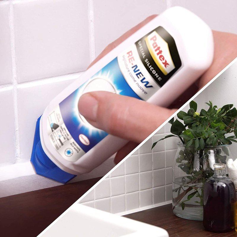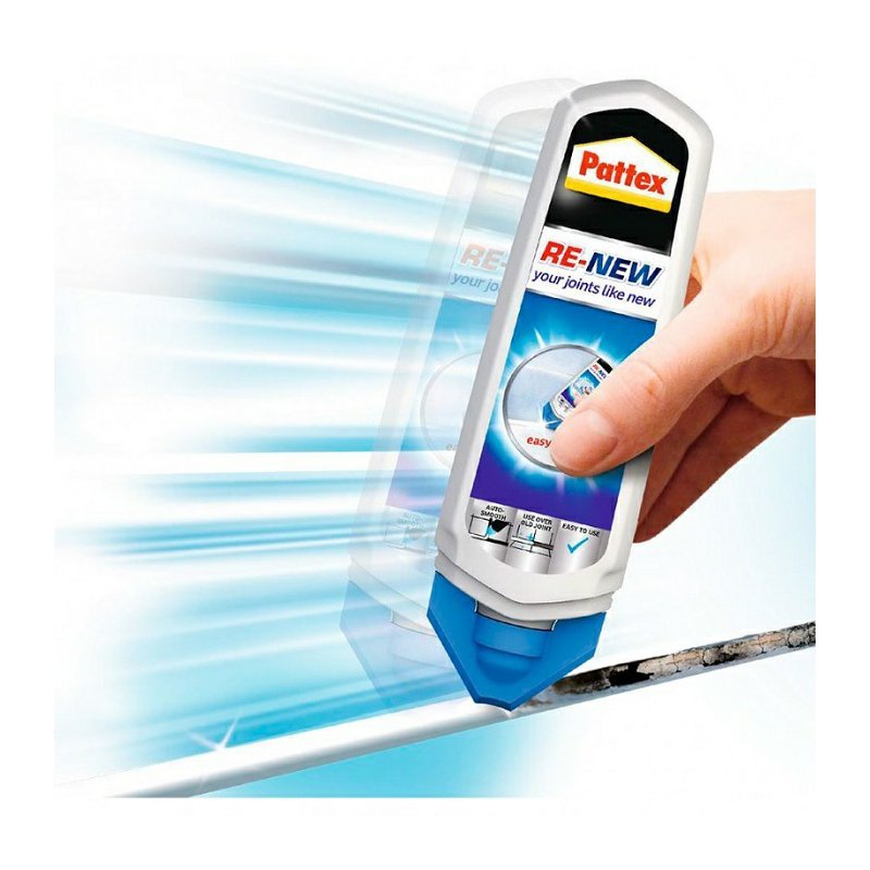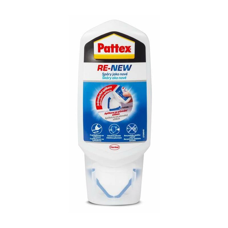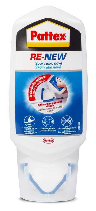PATTEX RE-NEW je opravný silikón na vodnej báze s odolnosťou proti vzniku plesní, ktorý je určený na prekrytie existujúceho silikónu v škáre. Silikón PATTEX RE-NEW vytvrdzuje pri izbovej teplote na elastickú, dlhotrvajúcu silikónovú hmotu s dlhou životnosťou. Opravný sanitárny silikón PATTEX RE-NEW RE-NEW je navhrnutý pre tvorbu jednoduchých a prefektných aplikácií. Tmel je pripravený na priame použtie.Nový, vylepšený aplikátor umožňuje jednoduché ovládanie prietoku tmelu. Výsledná škára je čistá a hladká. Vďaka novému obalu možno jednoducho vytlačiť tmel z tuby.