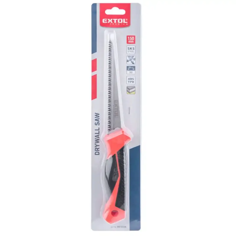 Ručná pílka na sadrokartón EXTOL Premium s dĺžkou čepele 150 mm je praktický pomocník na rýchle a čisté vyrezávanie otvorov a úpravy sadrokartónových dosiek. Vďaka ostrým trojstranne brúseným zubom a pohodlnej ergonomickej rukoväti zvládnete presné rezy aj v stiesnených miestach – či už pri montáži elektroinštalácie, výrezov pre krabice alebo úpravách okrajov dosiek.