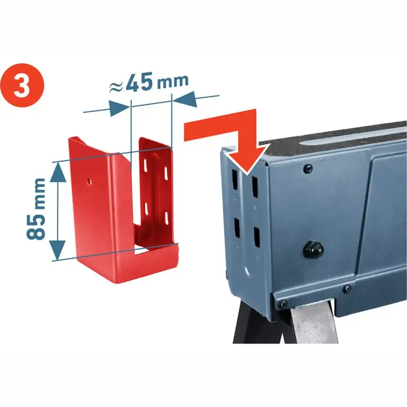 Na každý koniec je možné umiestniť bočný úchyt so šírkou 45 mm na uchytenie drevených fošní a vytvorenie stabilnej pracovnej plochy spojením dvoch podstavcov.
