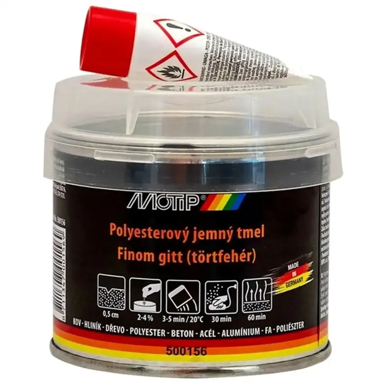 Jemný polyesterový tmel MOTIP Fine Putty je určený na finálne vyrovnanie drobných nerovností pred lakovaním. Vytvára hladký povrch, ľahko sa brúsi a vďaka jemnej štruktúre a dobrej priľnavosti pomáha dosiahnuť čistý výsledok pri opravách karosérie aj pri detailných opravách rôznych povrchov.