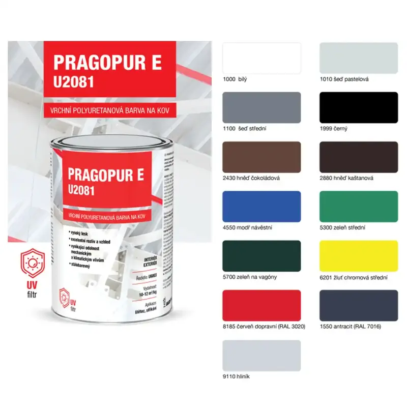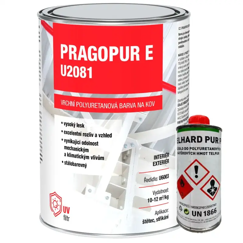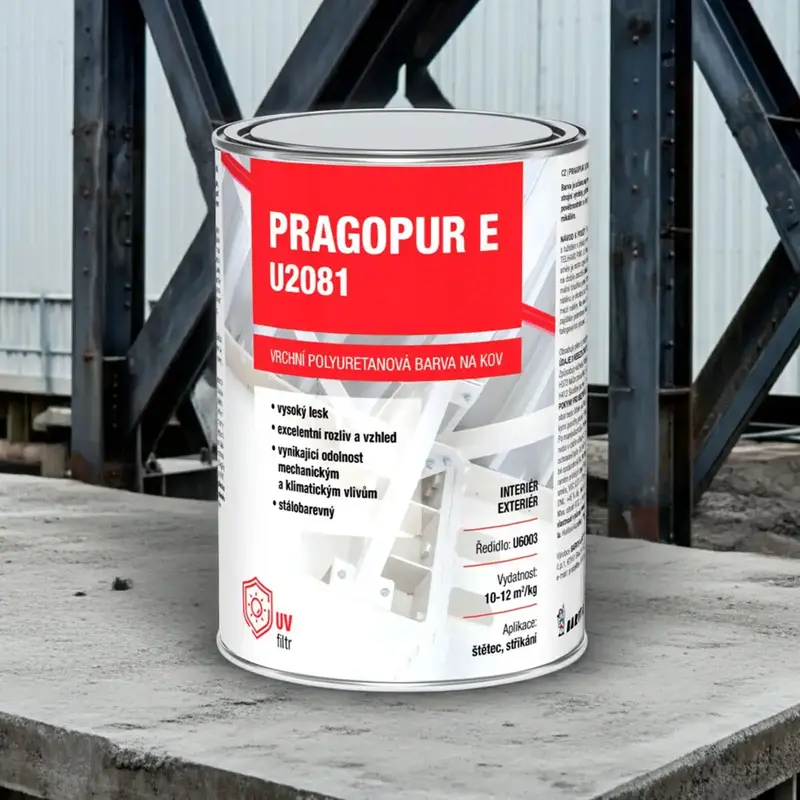 PRAGOPUR E U2081 je vrchná dvojzložková polyuretánová farba na kov s vysokým leskom a výborným rozlivom. Vytvára dekoratívny a odolný náter s dlhou životnosťou – odoláva poveternostným vplyvom, žltnutiu, kriedovaniu a pôsobeniu mnohých chemických látok aj vlhkosti. Ideálna pre kvalitnú povrchovú úpravu v interiéri aj exteriéri.