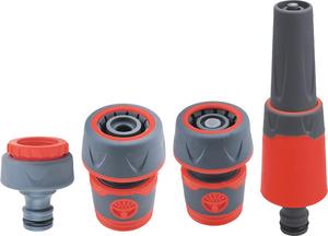 Postrekovač záhradný + rýchlospojky na hadicu plastové, 4-dielna sada, 3/4'': 1x plastová rýchlospojka s vnútorným závitom na 3/4“ záhradný ventil s adaptérom na 1/2“, 1x plastová rýchlospojka na hadicu 3/4“, 1x plastová rýchlospojka na hadicu 3/4“ so STOP ventilom, 1x postrekovač s plynule nastaviteľnou tryskou
