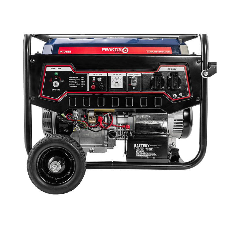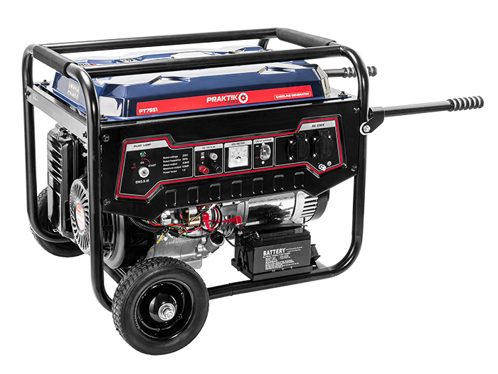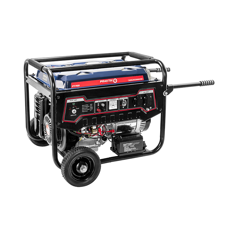 Elektrocentrála PRAKTIK PT7551 s výstupným výkonom 5000W je vhodná pre napájanie všetkých menších i väčších elektrických zariadení, teda spotrebičov. Benzínový štvortaktný motor zaisťuje jednoduchú aplikáciu a obsluhu. Ľahká a pohodlná na prenášanie na rôzne miesta. Rovnomerná práca a stála sila. Výstupné napätie je možné sledovať na indikátore napätia. Palivová nádrž umožňuje veľmi veľkú autonómiu v prevádzke a má indikátor množstva paliva. Na ovládacom paneli sú dve napäťové zásuvky 230V, čo umožňuje súčasné používanie dvoch spotrebičov. Má tiež zásuvku s výstupným napätím 12V.