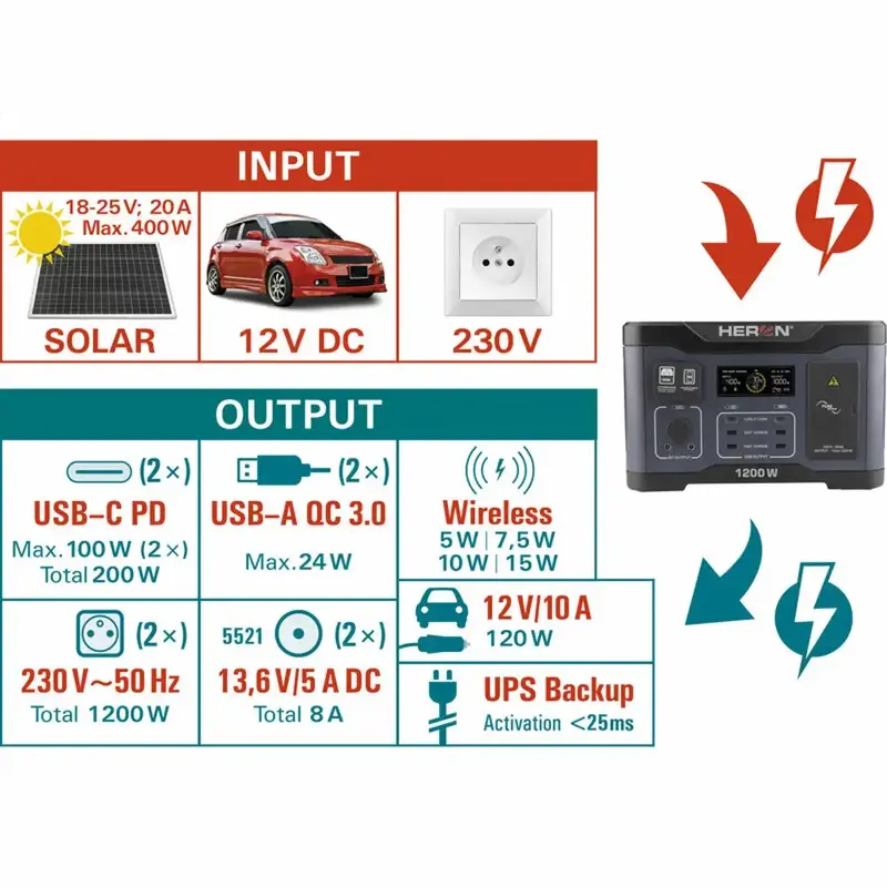 Stanica podporuje viac spôsobov dobíjania – z 230 V zásuvky, z 12 V autozásuvky aj zo solárneho panelu cez MPPT, takže energiu doplníte aj mimo civilizácie.