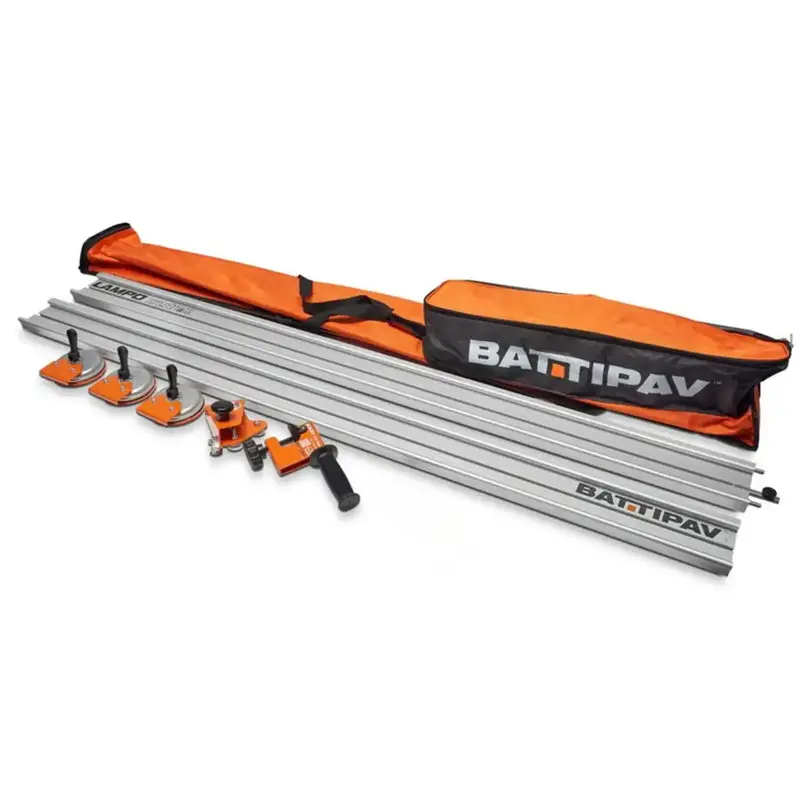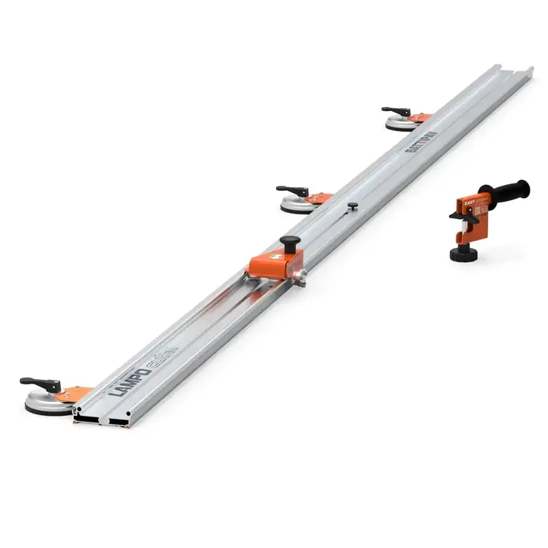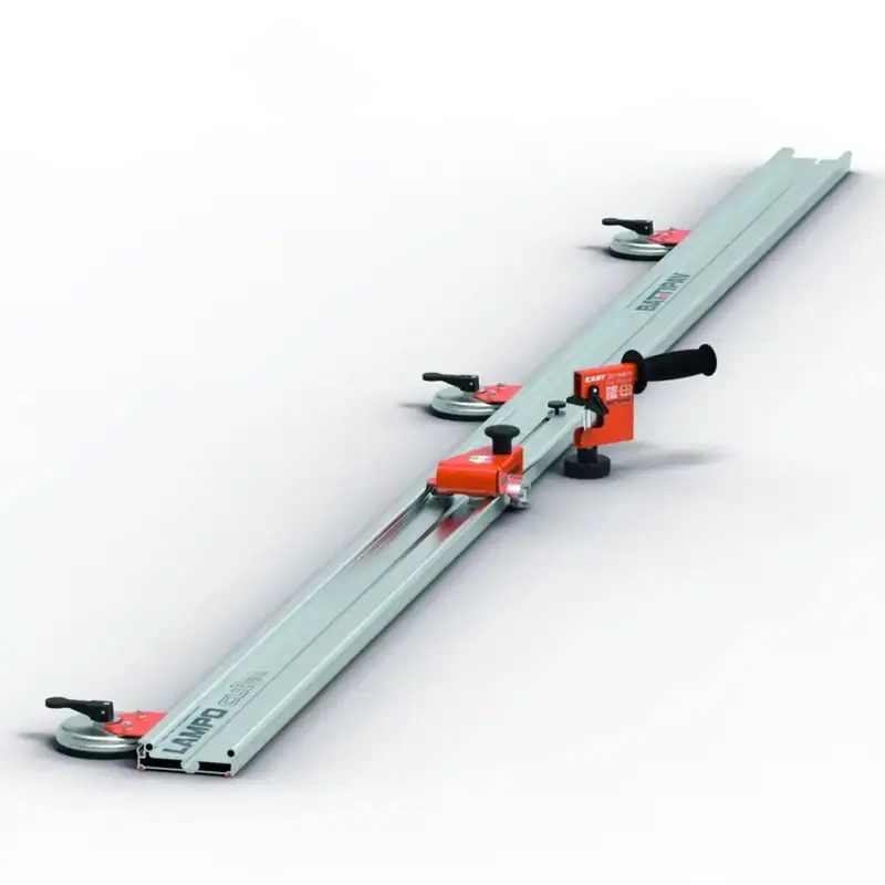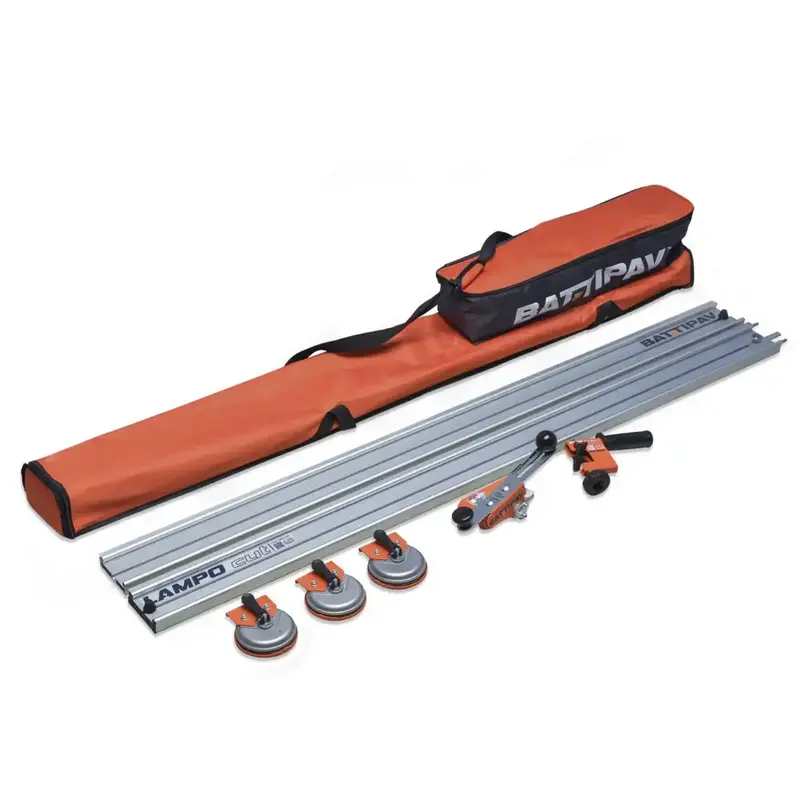 Rezačka veľkoformátových dlaždíc Battipav LAMPU Cut je praktické riešenie pre presné rezanie veľkoformátovej dlažby a obkladov priamo na stavbe. Vodiace lišty s pogumovanými plochami chránia povrch dlaždice, vákuové prísavky pomáhajú udržať stabilitu pri rezaní a vylepšený rezací vozík EVO zabezpečuje plynulý chod. Vďaka rezu až do 320 cm zvládnete aj naozaj veľké formáty bez kompromisov.