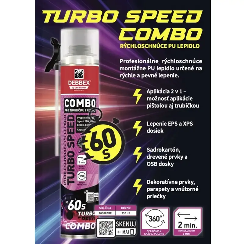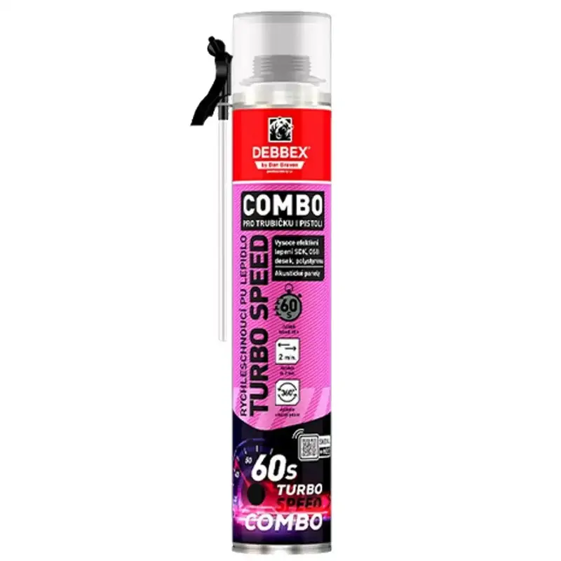 Rýchloschnúce PU lepidlo TURBO SPEED COMBO je profesionálne montážne a konštrukčné lepidlo v podobe peny, vyvinuté na rýchle a pevné lepenie už so začiatkom tuhnutia približne po 60 sekundách. Vďaka aplikácii 2v1 (trubičkou aj pištoľou), vysokej priľnavosti k bežným stavebným podkladom a objemovej stálosti po vytvrdnutí je ideálne na zatepľovanie, sadrokartónové konštrukcie, drevostavby aj interiérové montáže.