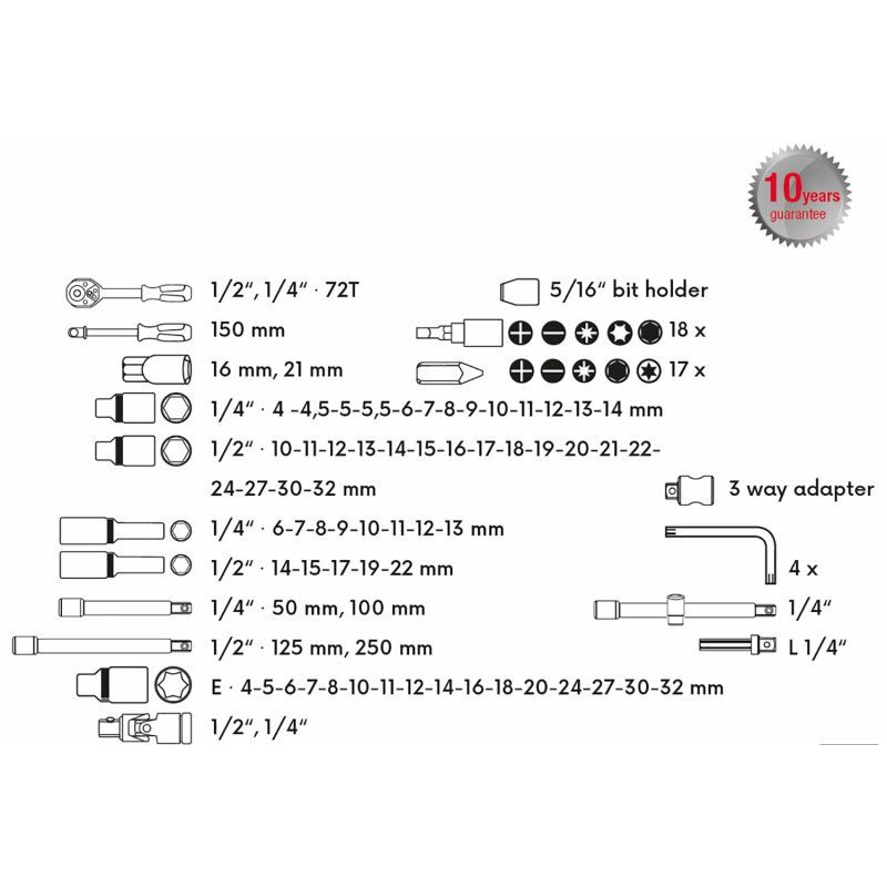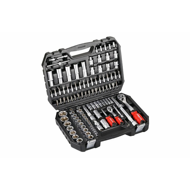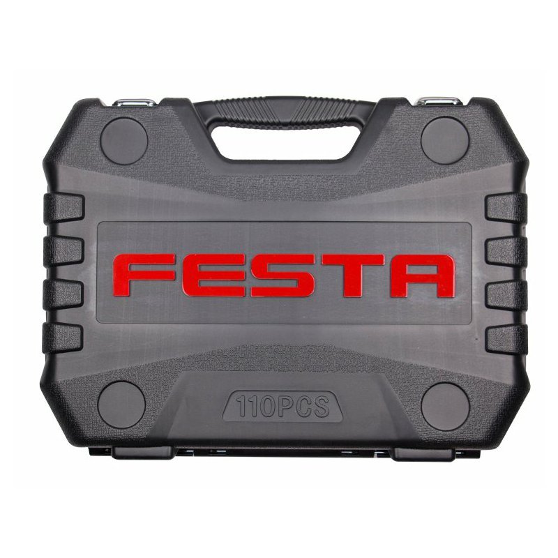 Kvalitná gola sada FESTA je vhodná vďaka kvalite použitých materiálov a spracovaniu v profesionálnej autodielni alebo servise. Všetky časti gola sady sú vyrobené z vysoko kvalitnej chróm-vanádiovej ocele s niklovou povrchovou úpravou. Hroty bitov sú zo zliatiny ocele S2. Račne majú jemné delenie 72 zubov, telo račne je vyrobené z CrV ocele, zubový mechanizmus z S2 ocele. Ergonomicky tvarovaná rukoväť so zdravotne nezávadnou gumou umožňuje pevný úchop so zníženou námahou rúk. Nový dizajn plastového kufra z primárneho materiálu s kovovými uzávermi a pántami veka poskytuje prehľadné a bezpečné uloženie náradia.