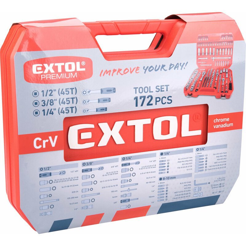 Rozsiahla sada nástrčných kľúčov EXTOL Premium ponúka široké možnosti použitia v dielni, na stavbe, montáži aj pri bežných kutilských prácach a drobných opravách. Vďaka sade rační a nástrčných kľúčov povolíte a utiahnete takmer každú skrutku. Takúto kompaktnú sadu náradia ocení každý zručný domáci kutil, remeselník, živnostník.