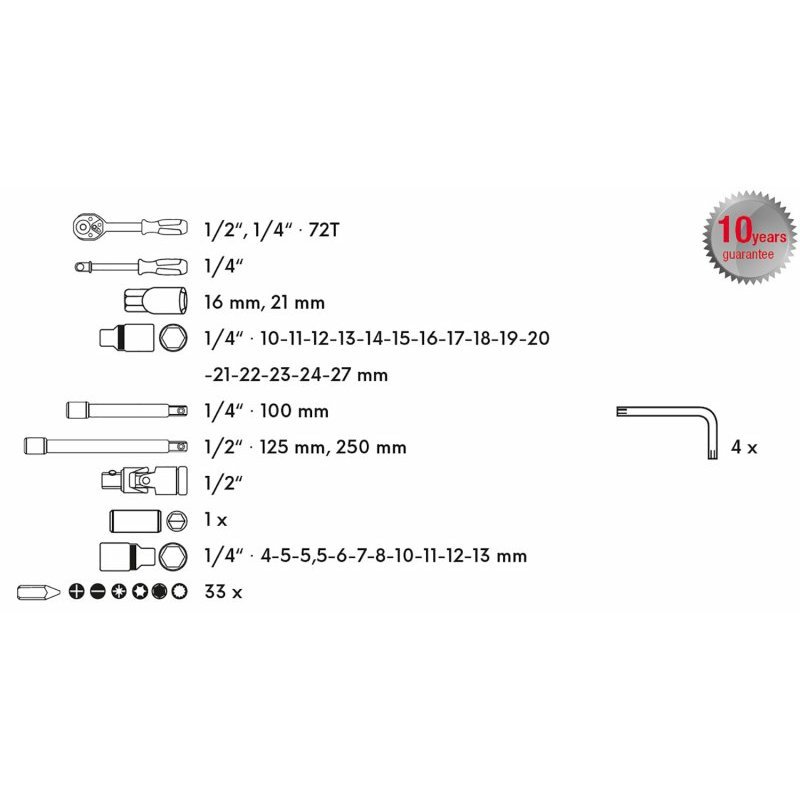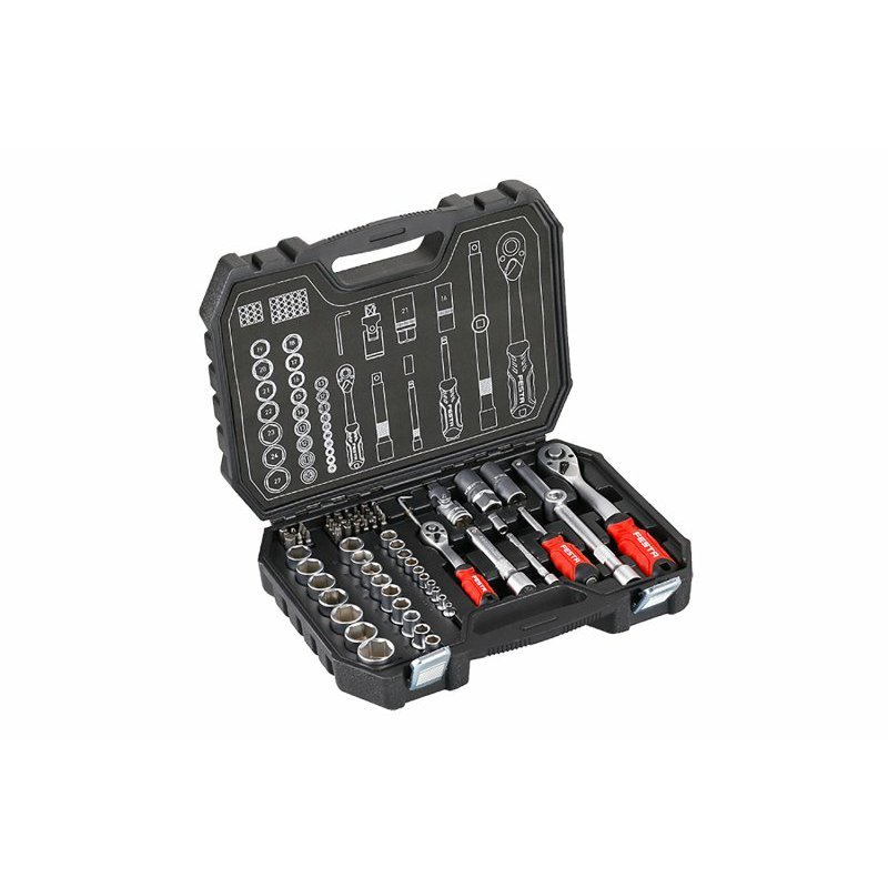 Kvalitná gola sada FESTA je vhodná vďaka kvalite použitých materiálov a spracovaniu v profesionálnej autodielni alebo servise. Všetky časti gola sady sú vyrobené z vysoko kvalitnej chróm-vanádiovej ocele s niklovou povrchovou úpravou. Hroty bitov sú zo zliatiny ocele S2. Račne majú jemné delenie 72 zubov, telo račne je vyrobené z CrV ocele, zubový mechanizmus z S2 ocele. Ergonomicky tvarovaná rukoväť so zdravotne nezávadnou gumou umožňuje pevný úchop so zníženou námahou rúk. Nový dizajn plastového kufra z primárneho materiálu s kovovými uzávermi a pántami veka poskytuje prehľadné a bezpečné uloženie náradia.