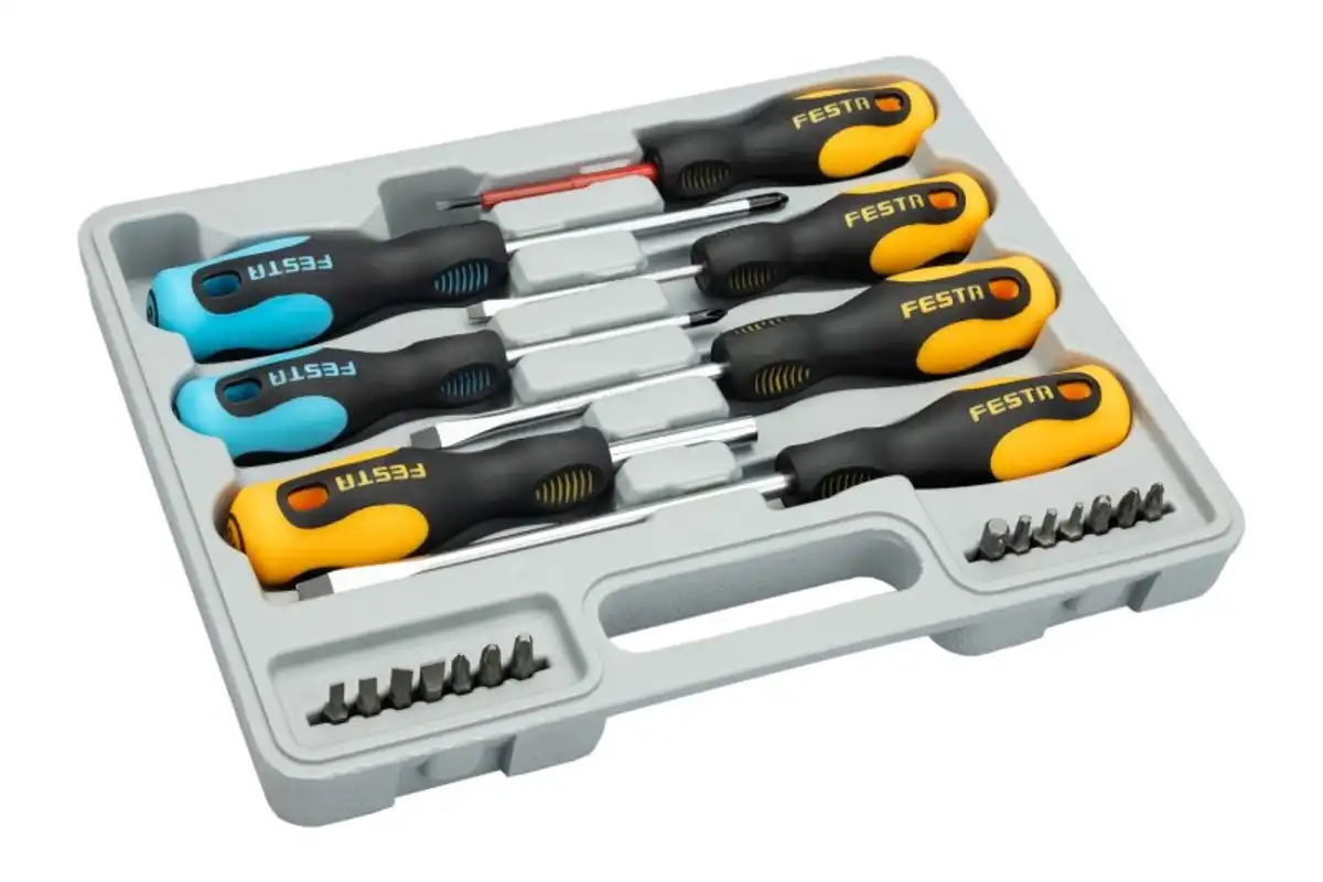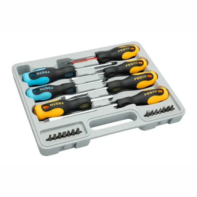 Sada skrutkovačov a bitov 21 ks. Sada obsahuje 21 ks: 4x plochý skrutkovač, 2x krížový skrutkovač, 1x skrutkovač s bitmi, 14x bity. Sada v praktickom plastovom púzdre, CrV, magnetická koncovka, ergonomicky tvarovaná rukoväť.