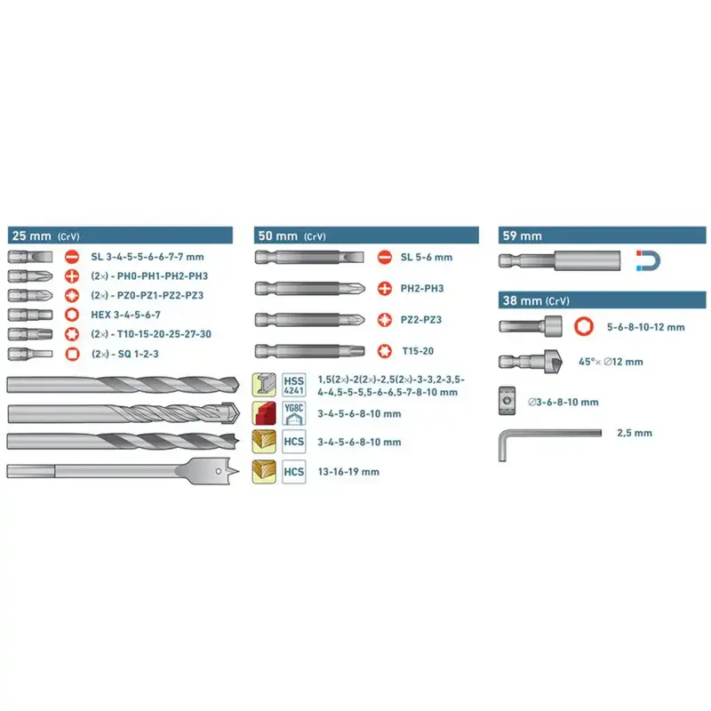 Vrtáky do kovu sú z HSS a vrtáky do muriva majú karbidový hrot pre účinnejší záber v tvrdších materiáloch. Bity a nástrčné hlavice sú z CrV ocele pre spoľahlivý prenos sily.