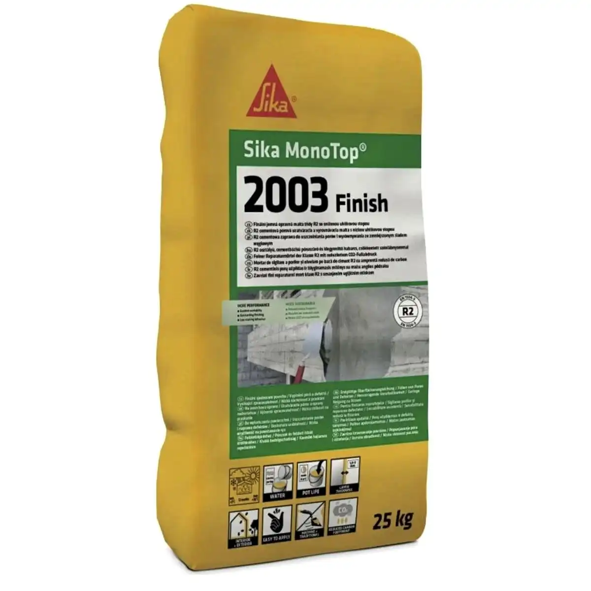 Sika MonoTop-2003 Finish je jemnozrnná, jednosložková cementová malta obohatená polymérmi, určená na finálne úpravy betónových povrchov. Vyznačuje sa vynikajúcou spracovateľnosťou, ľahkou aplikáciou a hladkým povrchom po vytvrdnutí. Táto malta je ideálna na vyhladzovanie nerovností, opravy povrchových defektov a estetické úpravy betónových konštrukcií. Sika MonoTop-2003 Finish poskytuje trvanlivé a kvalitné výsledky v interiéri aj exteriéri, pričom zvyšuje odolnosť a vzhľad betónových povrchov.