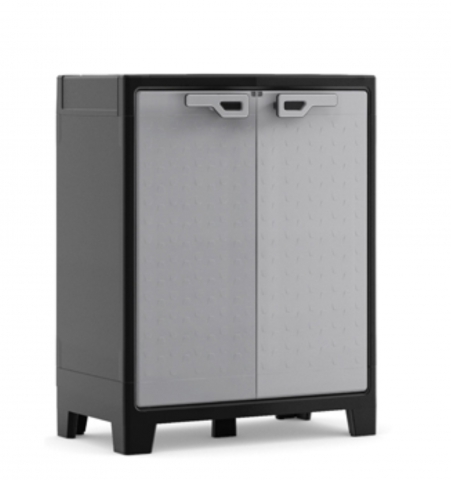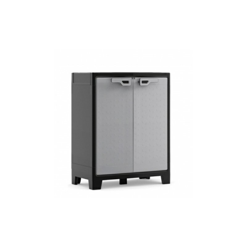 Skrinka Titan, plastová, čierno/sivá. Vhodná na terasy a do exteriéru. Odolná voči vode. Sklopné police, nastaviteľné nožičky, výborné uzatváranie. Počet políc: 3 police. Nosnosť police: 30kg. Rozmer: 80x44x100cm.