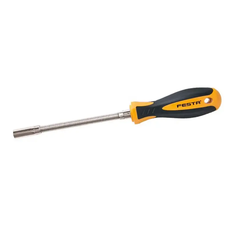 Flexi nástrčný skrutkovač 7 mm má kovový driek so špirálovým pružným predĺžením vyrobený z veľmi kvalitnej chrómvanádiovej ocele , povrchovo chránený tvrdochrómom, kombinácia polypropylénu a gumy na ergonomicky tvarovanej rukoväti zaručuje výborné antisklzové vlastnosti a dobroú odolnost voči mazivám a chemikáliam.