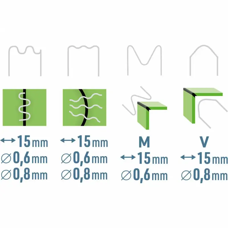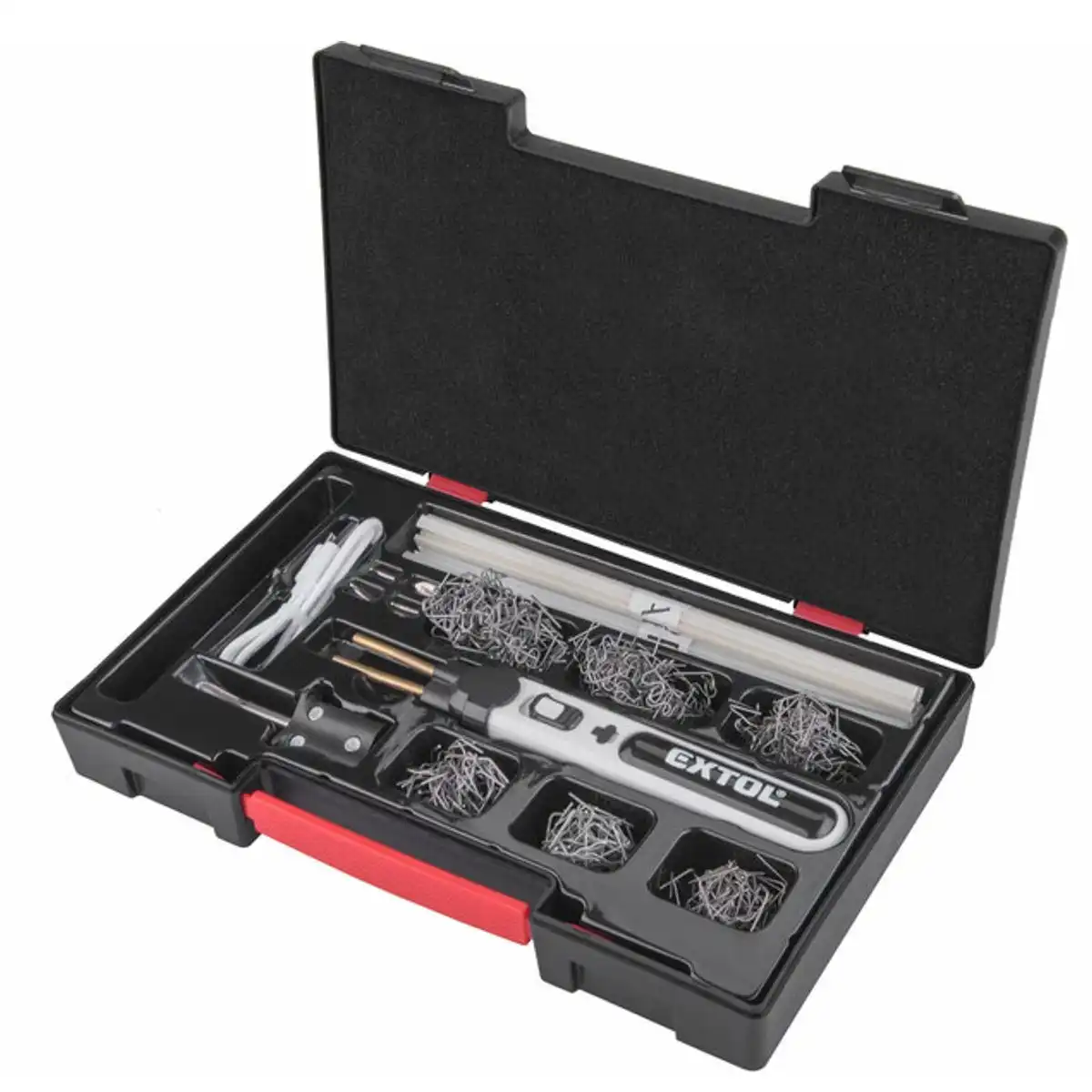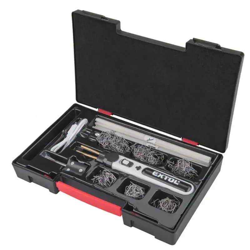 Súčasťou sady sú spony rôznych tvarov (vlnka, vlna, M, V), nadstavec na spájanie plastov a plastové plniace tyčinky (ABS/PP/PE) na doplnenie materiálu v mieste opravy.