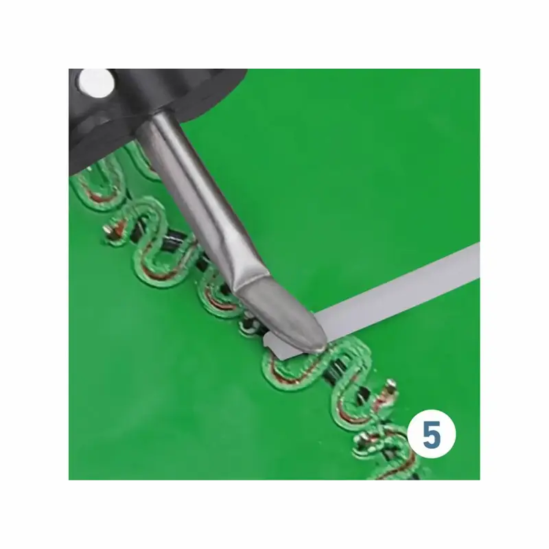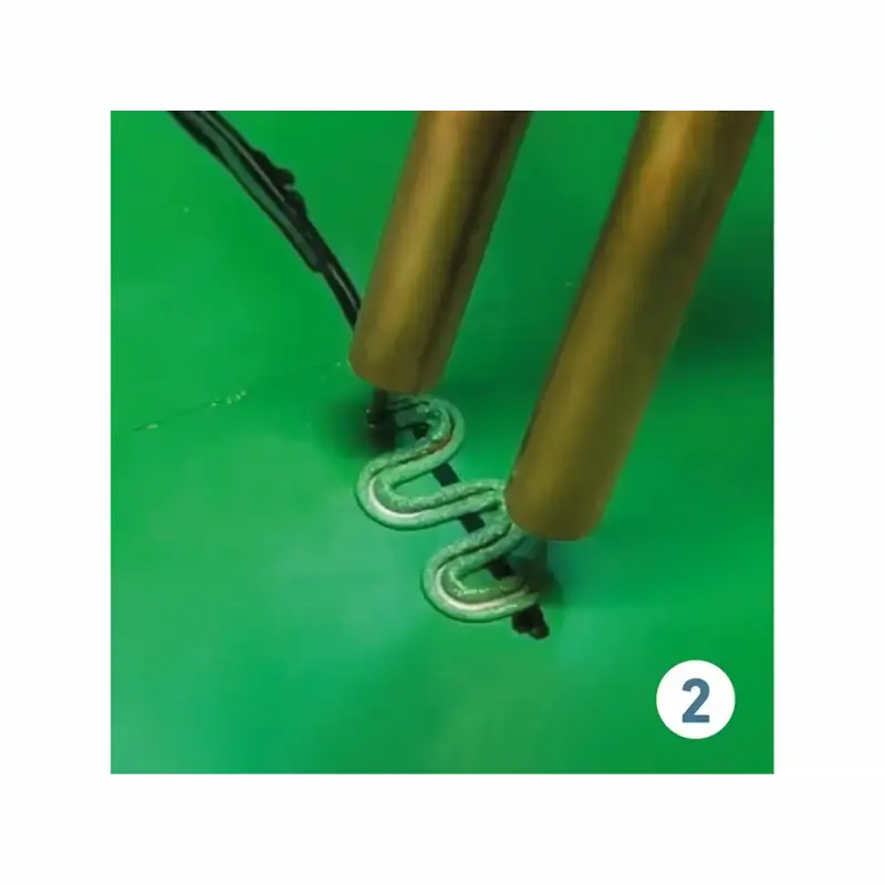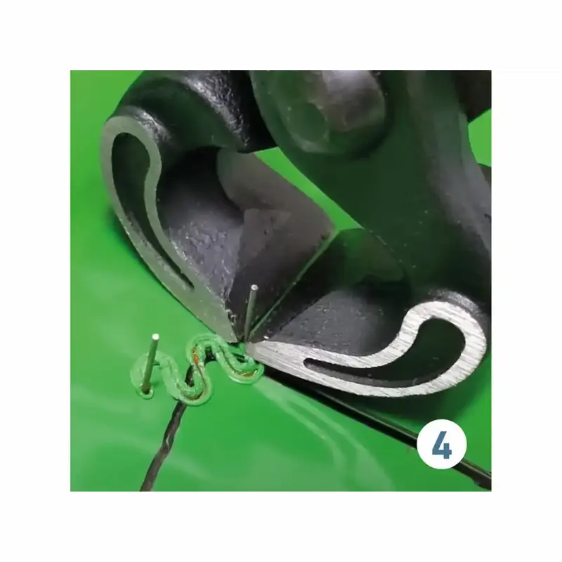 Zvoľte vhodný tvar spony podľa praskliny (vlnka, vlna, M pre vonkajší roh, V pre vnútorný roh). Sponu zasuňte plytko do koncoviek, nahrejte 2–3 s a zatavte približne do polovice hrúbky plastu.
