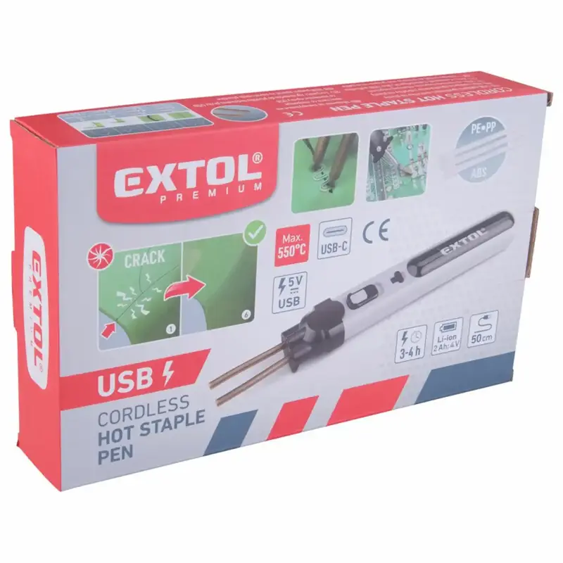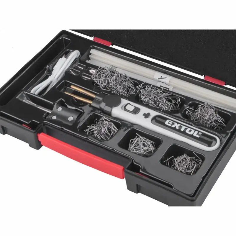 Akumulátorová zváračka sponkovacia na plasty EXTOL PREMIUM 8891505 je kompaktný a ľahký pomocník na rýchle spevnenie prasklín a opravy plastových dielov. Vďaka rýchlemu nahriatiu spony za 2–3 sekundy, napájaniu z integrovanej Li-ion batérie 4 V / 2 Ah a nabíjaniu cez USB-C zvládnete čisté, pružné a trvácne spoje aj v ťažko prístupných miestach.