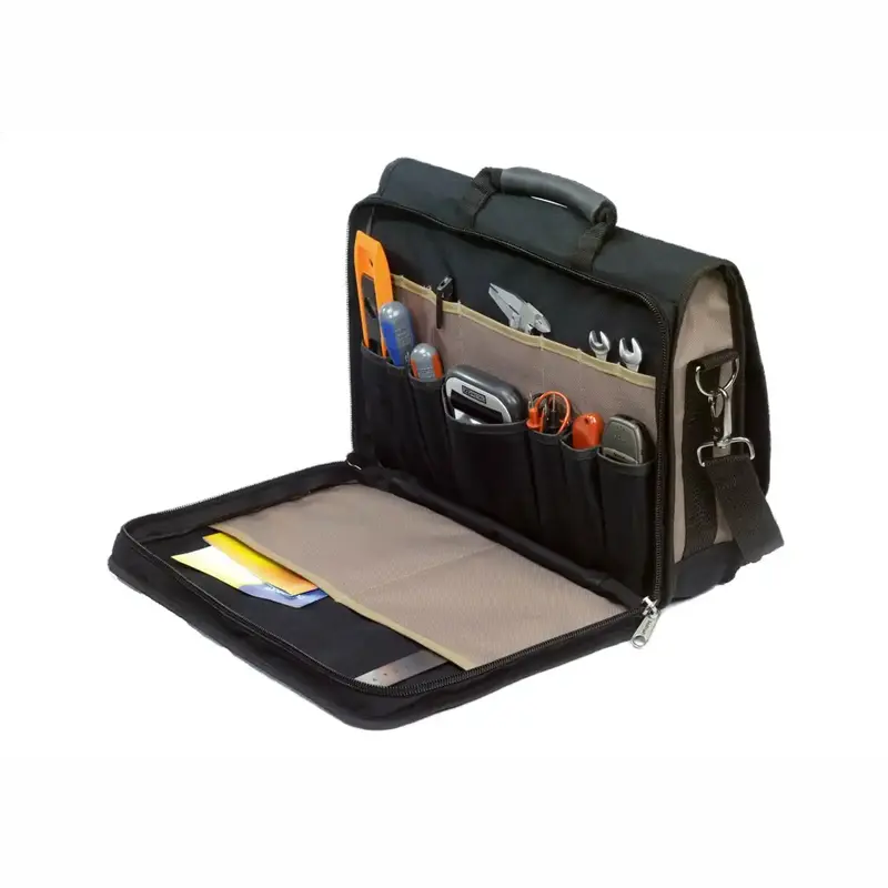 Veľká hlavná komora so zipsom a množstvo ďalších (zipsových) vreciek a úchytov – približne 30 úložných možností pre rôzne veľkosti náradia, doplnkov a dokumentov.