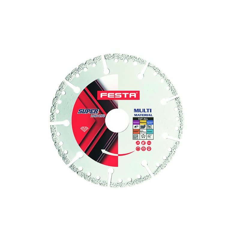 Univerzálny diamantový rezný kotúč FESTA Multi je špičkový nástroj navrhnutý na efektívne rezanie širokého spektra materiálov vrátane dreva, kovu, plastov a muriva. Diamantové segmenty zabezpečujú vysokú odolnosť a dlhú životnosť, a zároveň poskytujú presný a čistý rez. Kotúč je určený pre použitie s uhlovými brúskami. Univerzálny kotúč je inovatívnym riešením pre domáce dielne, remeselníkov aj profesionálne stavebné projekty. S výnimočnou výkonnosťou a presnosťou umožňuje kotúč FESTA Multi rýchle a efektívne rezanie, čím zvyšuje produktivitu a znižuje časovú náročnosť pri práci s rôznymi materiálmi.