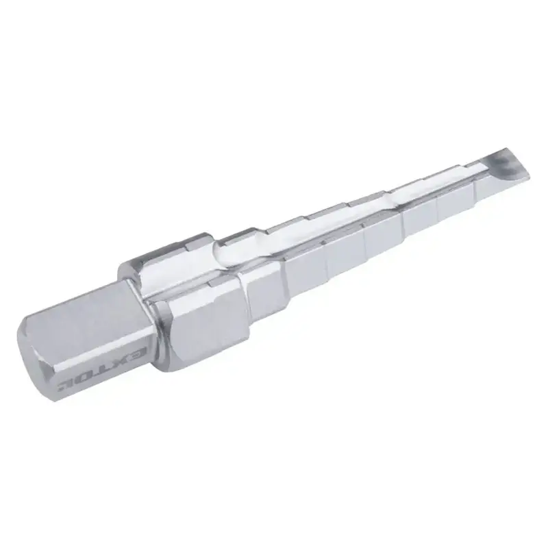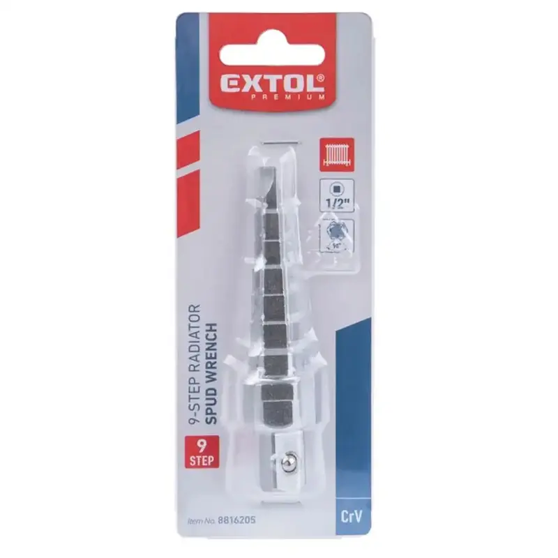 Kľúč na radiátory EXTOL Premium je praktický špeciálny nástroj určený na montáž, demontáž a servis radiátorových prvkov. Vďaka 9-stupňovému vyhotoveniu, vonkajšiemu štvorhranu a plochému hrotu ponúka univerzálnejšie využitie pri práci s rôznymi rozmermi vnútorných profilov. Pochrómovaný povrch a vyhotovenie z chróm-vanádiovej ocele prispievajú k odolnosti a spoľahlivosti pri bežnom aj náročnejšom použití.
