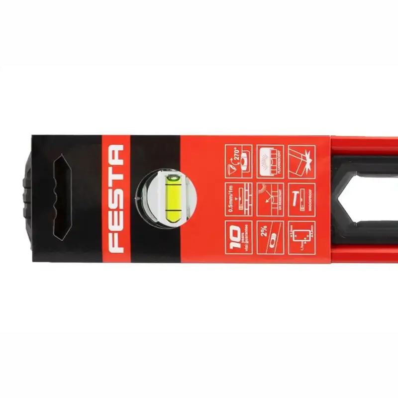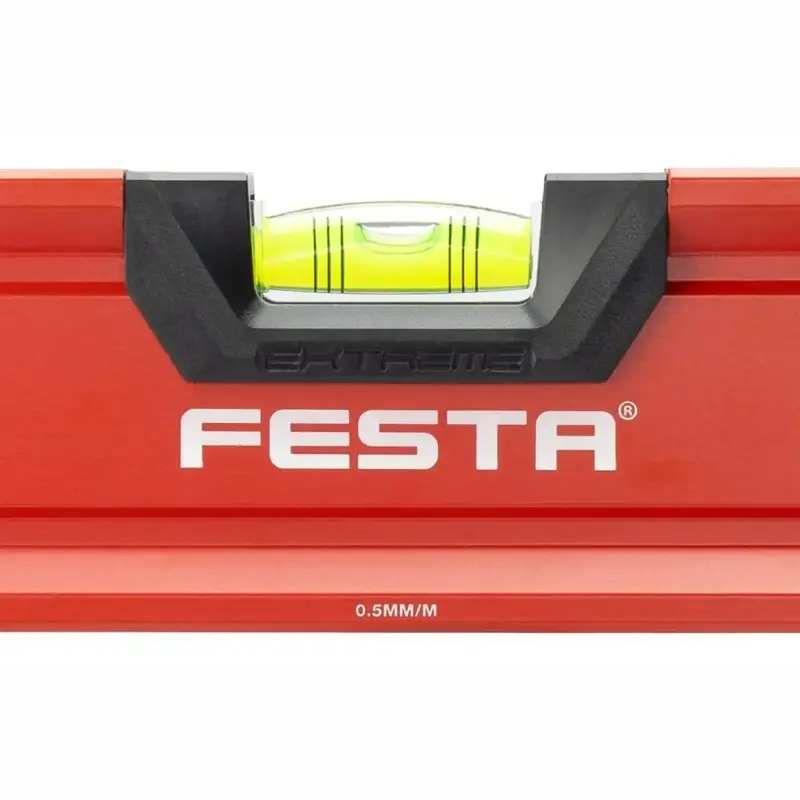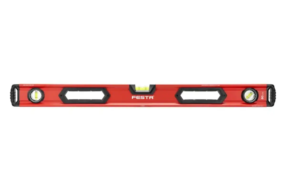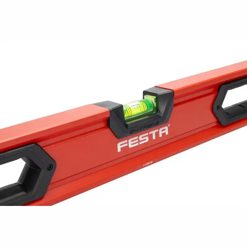 Presná a odolná vodováha FESTA s tromi libelami a ergonomickými madlami pre jednoduchú manipuláciu. Ideálna na presné merania pri stavebných a remeselných prácach.