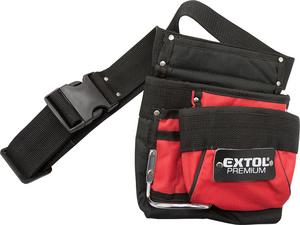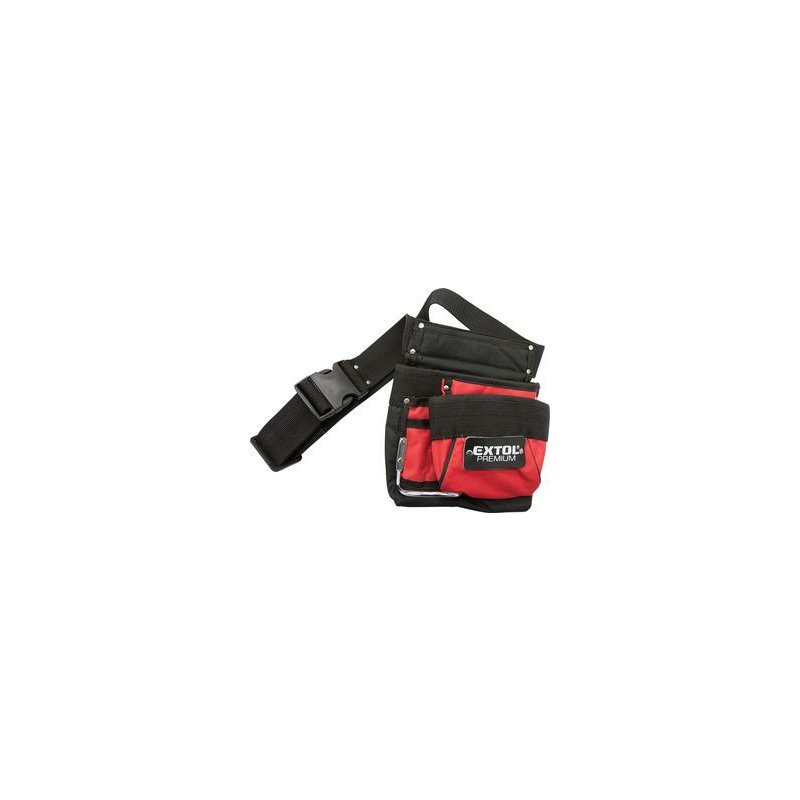 Vrecko na náradie jednodielne s opaskom, 3 vrecká, nylónové (1 veľké, 1 stredné, 1 malé), držiak na kladivo, úchyty pre ceruzu alebo skrutkovač Materiál: nylon spojený extra silnými nitmi, opasok s plastovou rýchloupínacou prackou