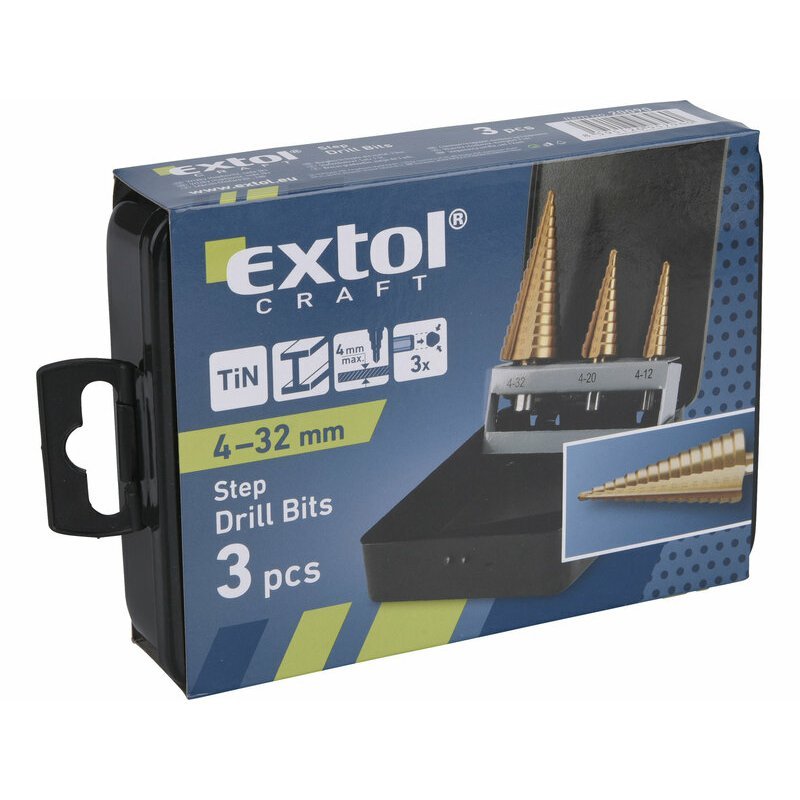 Stupňovité vrtáky EXTOL Craft je možné použiť na vŕtanie do mäkších materiálov, napr. mäkkých kovov, dreva, plastov a plexiskla. Kužeľový vrták je určený na plynulé a bezhrotové vŕtanie a navŕtanie otvorov bez deformácie plechu. Vrtáky je možné znovu naostriť.