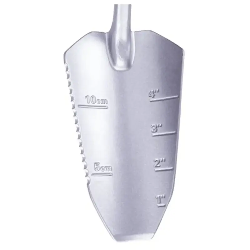 Pomocou lopatky vyhĺbte jamku alebo uvoľnite substrát, vložte rastlinu a zeminu jemne pritlačte. Stupnicu využite na kontrolu hĺbky výsadby.