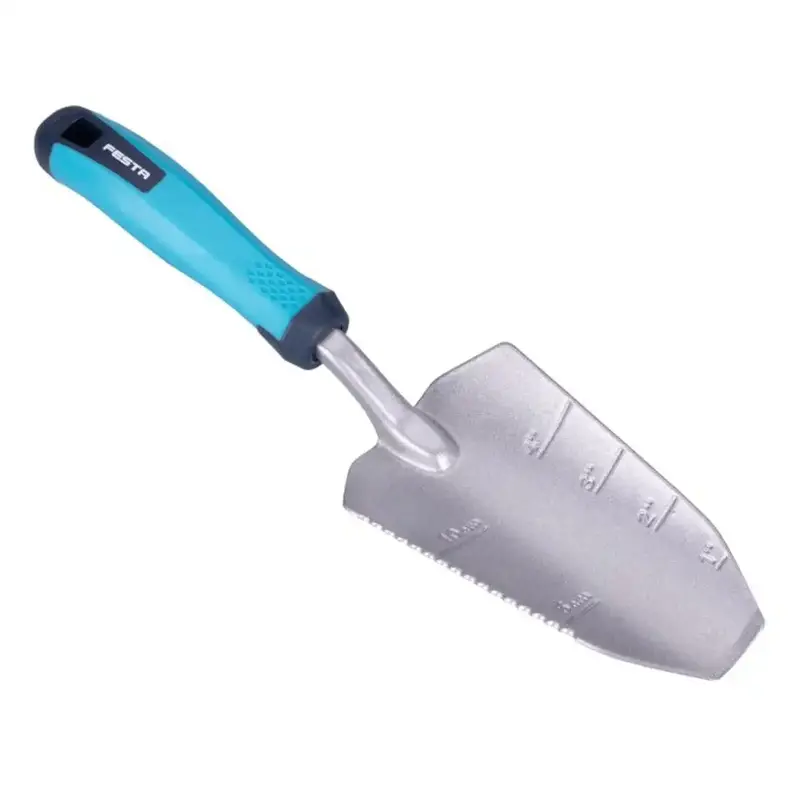 Široká záhradná lopatka FESTA Garden je praktické ručné náradie na každodenné práce v záhone, kvetináči aj skleníku. Je vyrobená z ľahkej a odolnej zliatiny hliníka, má ergonomickú pogumovanú rukoväť a ostrý hrot pre jednoduchší prechod zeminou – ideálna na sadenie, presádzanie aj kyprenie.